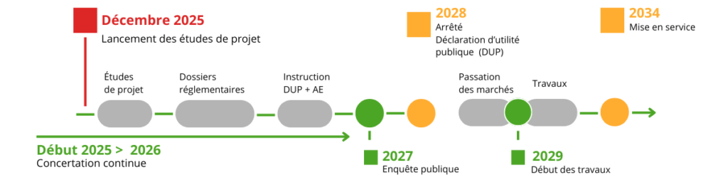 Conformément au calendrier prévisionnel, la version définitive du projet sera présentée à l’enquête publique en 2027, avec pour objectif l’obtention de la déclaration d’utilité publique en 2028.