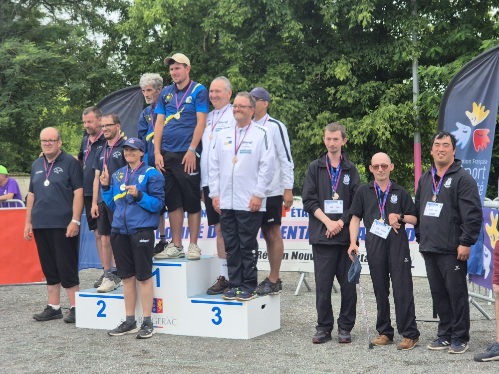 Pour leur première participation au championnat de France para-pétanque adaptée (Bergerac 2025), la triplette composée de Hugo Bellamy, Cédric Jean et Stéphane Blin termine sur la 3e marche du podium et décroche ainsi la médaille de bronze –> catégorie CD.